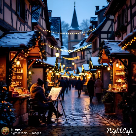 "an artist sketching in a europen night chrisymas market in a small older village with traditional architecture in hyper realistic photo style, with partical emphasis on market lighting"