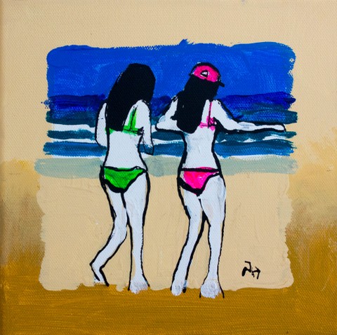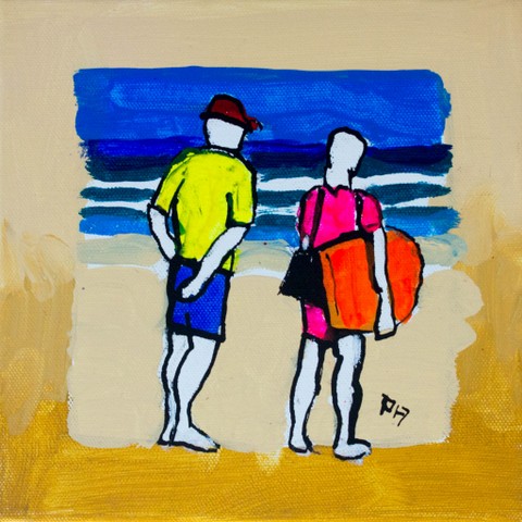 Observing the prevalence of fluorescent colors in beach attire, I incorporated vibrant acrylic paints against backgrounds of classic coastal hues: sky blue, deep ocean blue, viridian, and creamy sand tones. The figures are intentionally left blank and anonymous, symbolizing the beach's cyclical nature - bustling in summer, empty in winter. To emphasize the spontaneous, hand-drawn quality of the pieces, I added linework using Indian ink applied with a handmade reed pen. This final touch brings a sense of whimsy and authenticity to each canvas.