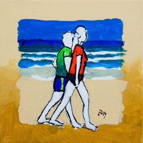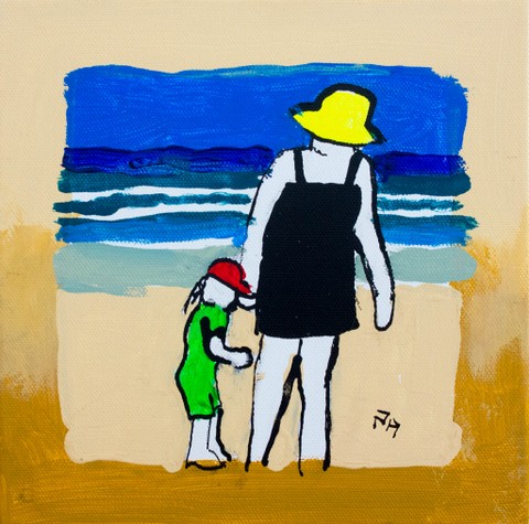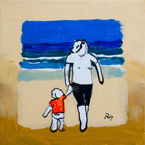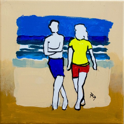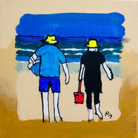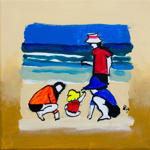 Observing the prevalence of fluorescent colors in beach attire, I incorporated vibrant acrylic paints against backgrounds of classic coastal hues: sky blue, deep ocean blue, viridian, and creamy sand tones. The figures are intentionally left blank and anonymous, symbolizing the beach's cyclical nature - bustling in summer, empty in winter. To emphasize the spontaneous, hand-drawn quality of the pieces, I added linework using Indian ink applied with a handmade reed pen. This final touch brings a sense of whimsy and authenticity to each canvas.